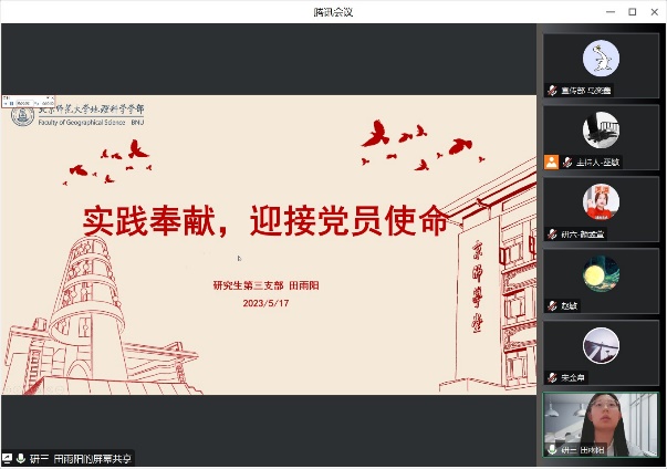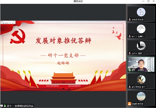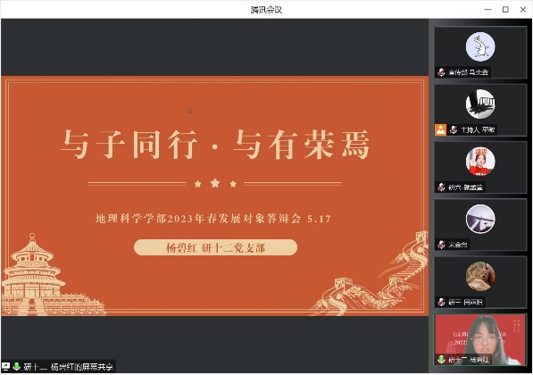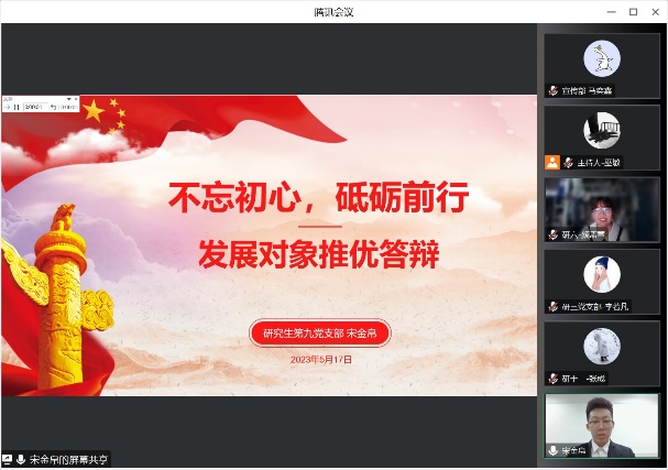 为进一步加强和推进党员队伍建设,切实提高党员发展质量,地理科学学部于2023年5月17日至18日线上开展了2022-2023学年春季学期发展对象推优答辩会,答辩会的评委由学部党委委员、专职辅导员、学生党支部书记组成,会议由党建小组同学主持。