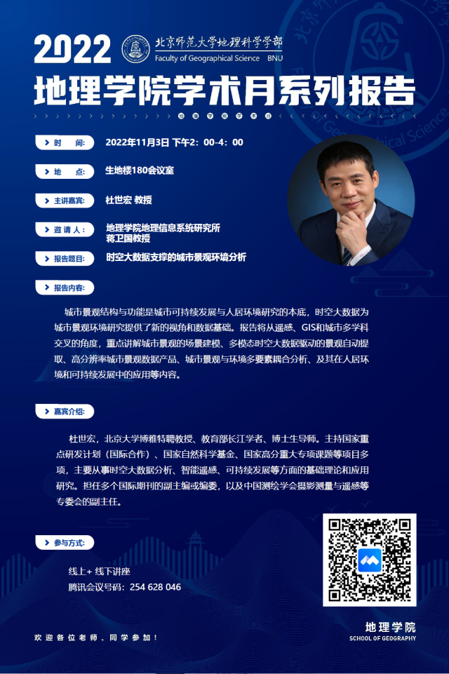 【11月3日讲座】地理学院学术月系列报告 杜世宏,时空大数据支撑的城市景观环境分析