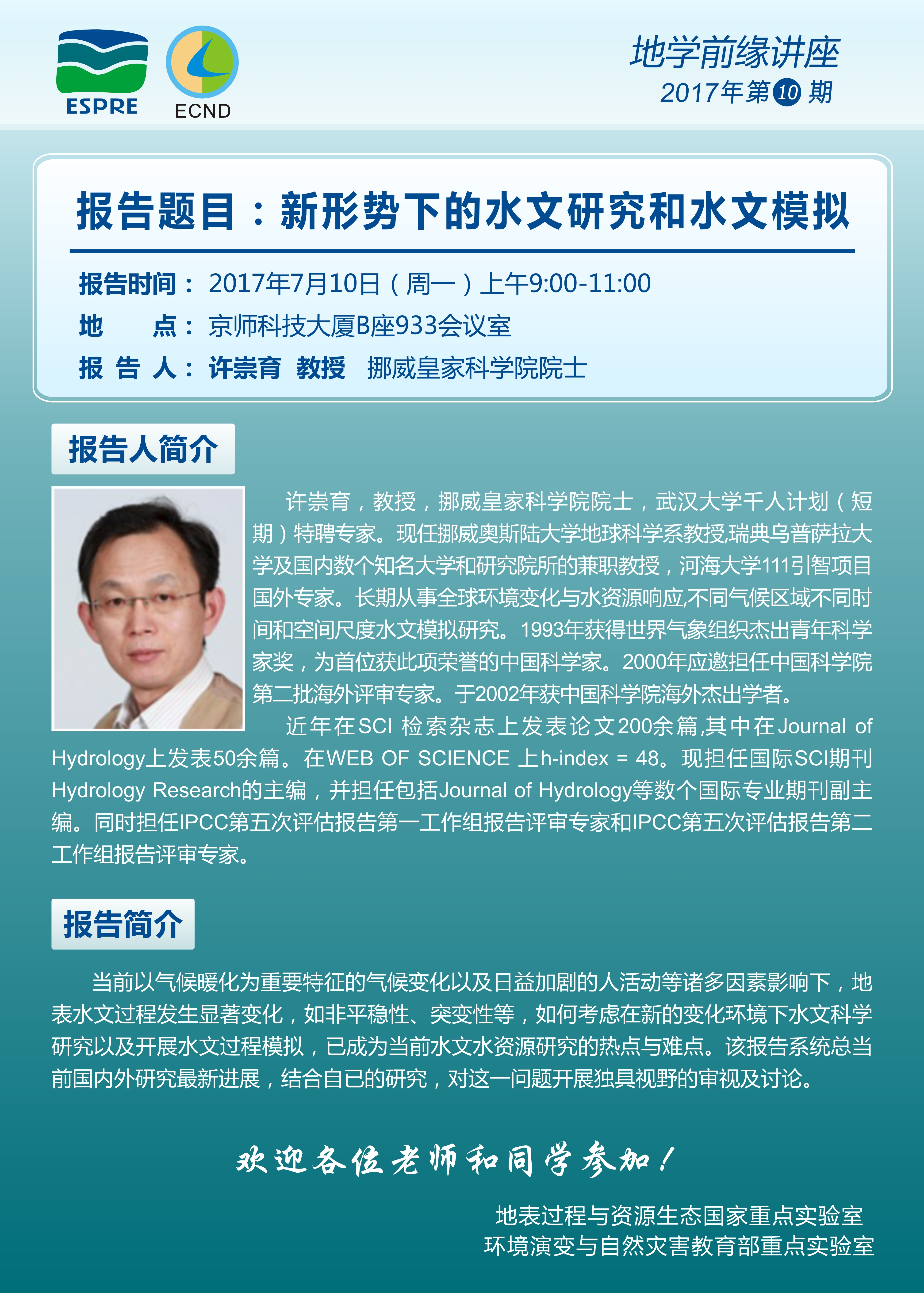【7.10地学前缘讲座】新形势下水文研究和水文模拟