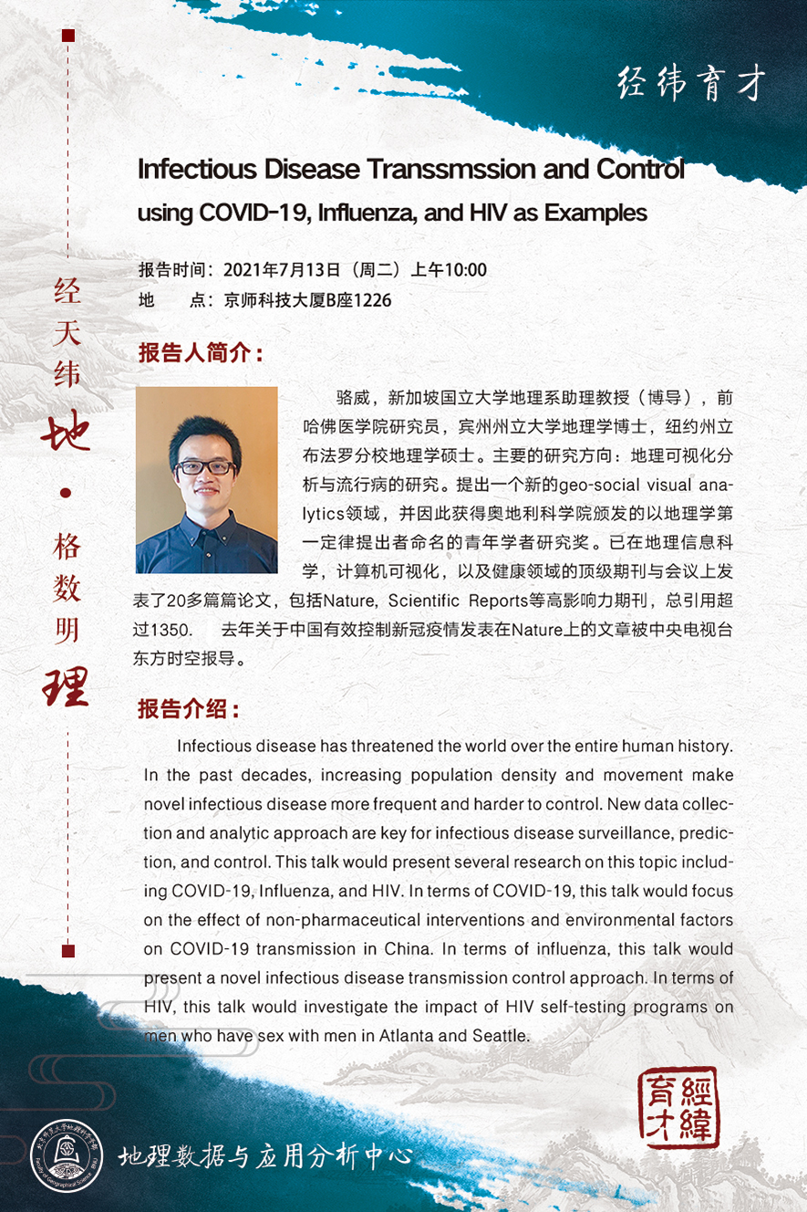【7月13日讲座】骆威,Infectious Disease Transsmssion and Control using COVID-19, Influenza, and HIV as Examples