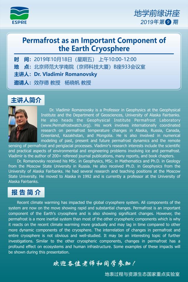 【1018地学前缘讲座】Permafrost as an Important Component of the Earth Cryosphere