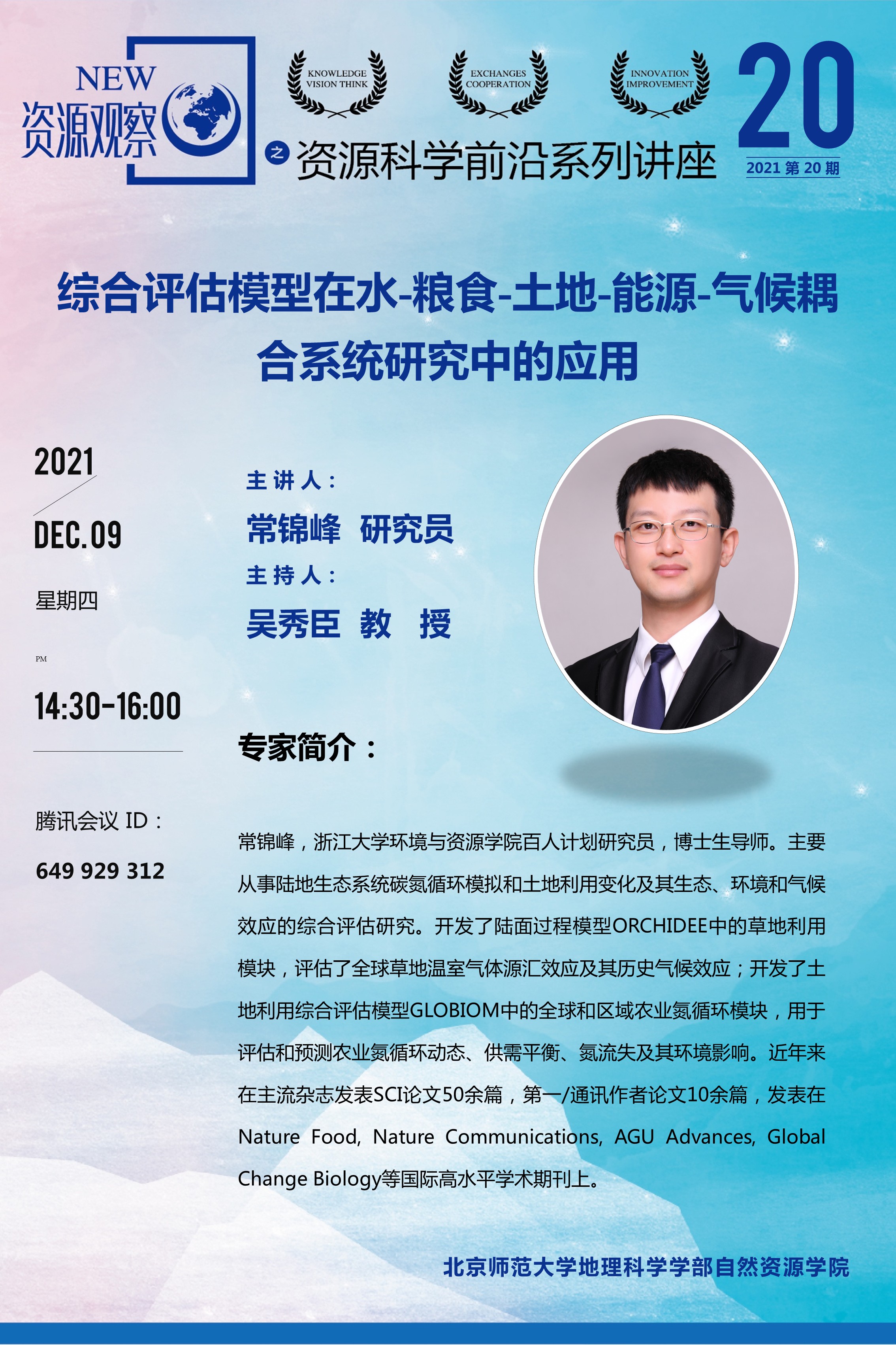 【12月09日讲座】常锦峰,综合评估模型在水-粮食-土地-能源-气候耦合系统研究中的应用
