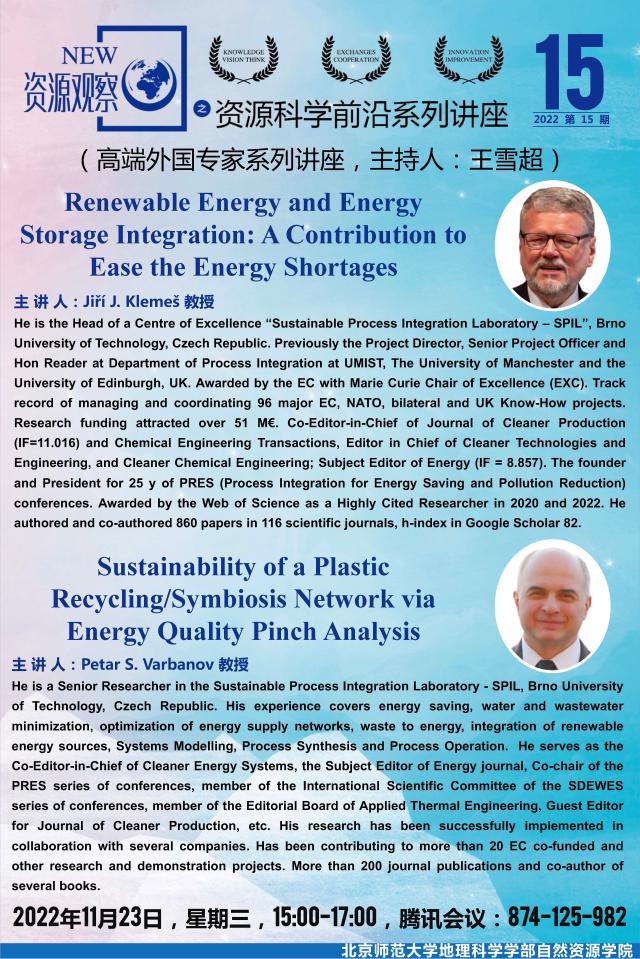 【11月23日讲座】Jiří J. Klemeš ,Estimating terrestrial gross primary production globally with solar-induced fluorescence ;Petar S. Varbanov,Sustainability of a Plastic Recycling/Symbiosis Network via Energy Quality Pinch Analysis
