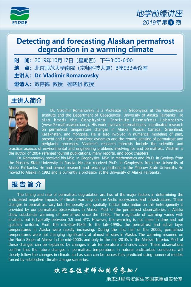 【1017地学前缘讲座】Detecting and forecasting Alaskan permafrost degradation in a warming climate