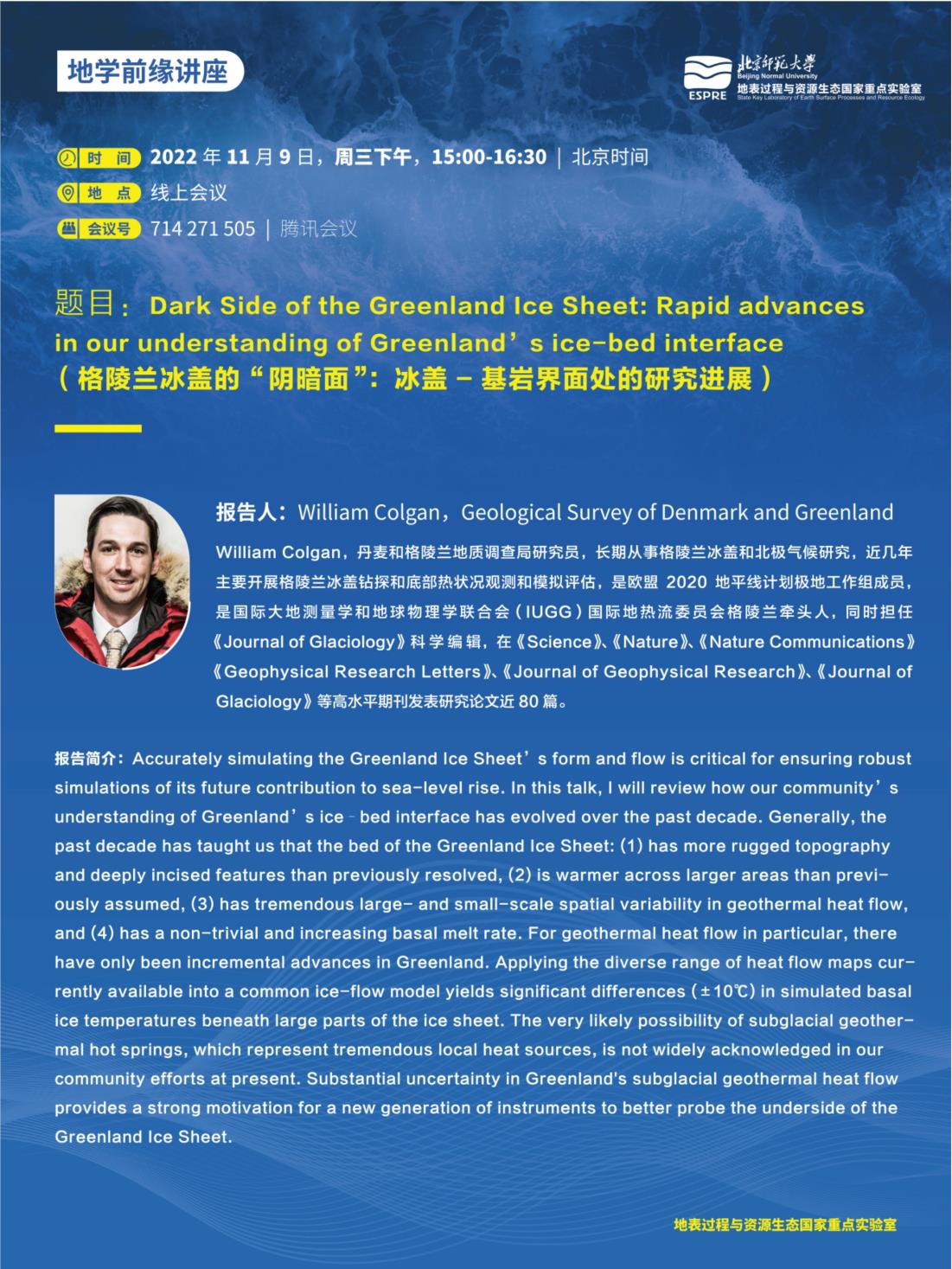 【11月9日讲座】William Colgan, Dark Side of the Greenland lce Sheet: Rapid advancesin our understanding of Greenland's ice-bed interface