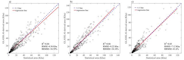结果表明,与2000-2008年县级统计年鉴记录的收获面积对比,该研究提取的三种作物收获面积精度较高,均方根误差RMSE和相对均方根误差RRMSE均分别低于12Kha和45%(图1)。三种作物2000、2005、2010和2015年的空间分布如图2-4所示。水稻主要广泛分布在东北平原、长江中下游平原、四川平原、云贵高原梯田和珠江三角洲。小麦的分布更为集中,主要在华北平原和四川平原。相比于水稻和小麦,玉米的分布横跨整个中国,包括东北、华北和西南地区。此外,该研究在5km尺度下进一步分析了作物种植面积的时间变化趋势(图5a1-a3),并按省汇总了具有显著性趋势的格点(图5b1-b3)。对于水稻,北方水稻收获面积显著增加而南方水稻收获面积下降。玉米主产区的收获面积大幅增加。小麦的收获面积总体下降,但主产区的收获面积显著增加。这些现象与人为因素、生物物理因素和社会经济因素有关,包括城市化、南方作物种植强度下降、气候变化带来的频繁的灾害、北方和西南地区大量废弃农田以及政府政策(如东北地区补贴玉米种植导致玉米大量替代小麦)等。