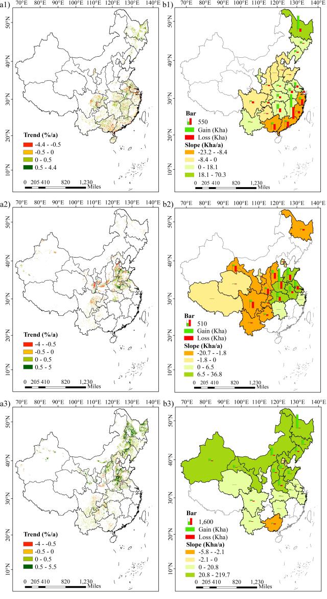 图2 (a1-a3): 5km尺度作物收获面积时间趋势变化的空间分布(p<0.1) b1-b3: 县级尺度上汇总的收获面积增加、减少量和斜率,均按水稻、小麦和玉米顺序