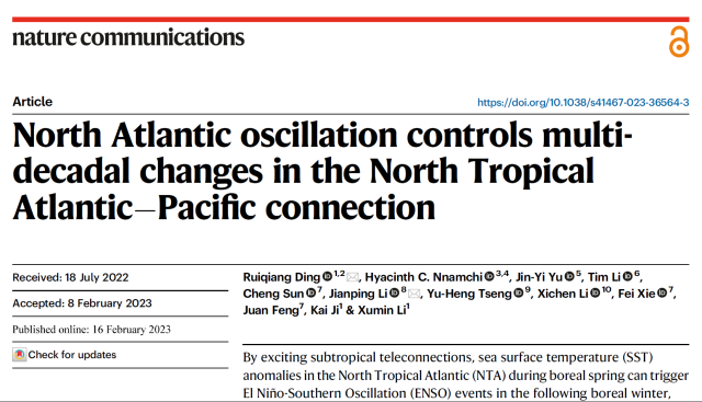 论文丁瑞强教授为论文第一作者和通讯作者,中国海洋大学李建平教授为共同通讯作者,论文共同作者还包括德国亥姆霍兹基尔海洋研究中心的Hyacinth C. Nnamchi博士、加利福尼亚大学的Jin-Yi Yu教授、夏威夷大学的李天明教授、北京师范大学的孙诚教授、台湾大学的曾于恒教授、中国科学院大气所的李熙晨研究员、北京师范大学的谢飞教授、北京师范大学的冯娟教授、兰州大学的史良博士以及南京信息工程大学的李徐敏博士。本研究得到国家自然科学基金(41790474, 41975070)和国家重点研发计划(2020YFA0608402)的共同资助。