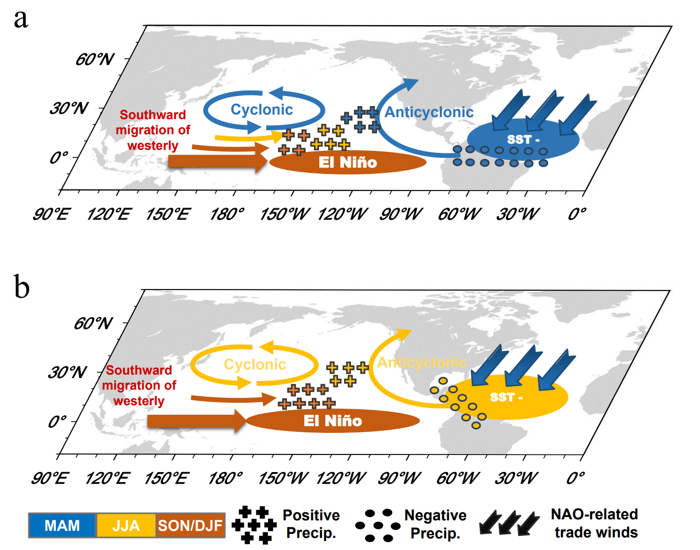 基于长时间序列的再分析资料和数值模式试验,北京师范大学地理学部丁瑞强教授及合作者提出了一个新的观点,指出热带北大西洋海温与ENSO关系的多年代际变化主要受北大西洋涛动(NAO)调制。他们提出了两种机制来解释北大西洋涛动的调制作用:(1)、当NAO处于正位相时,热带北大西洋区域出现了显著偏强的东北信风,增强了赤道大西洋地区的低层辐合,从而导致赤道大西洋地区的低层水汽含量和降水增多,赤道大西洋上空较湿润的基本态有利于热带北大西洋海温激发更强的对流来增强对ENSO的影响(图1a);(2)、当NAO处于正位相时,东北信风的增强加深了海洋混合层,增强了风-蒸发-SST(WES)反馈机制,进而增强了热带北大西洋海温从春季到夏季的持续性,有助于将大西洋影响持续地传递到太平洋(图1b)。该研究不同于以往的研究,将热带北大西洋海温与ENSO关系的多年代际变化归因于NAO的多年代际变化,而不是AMO或大西洋长期变暖趋势,这对于我们更好地了解大西洋和太平洋之间的跨海盆间相互作用有重要意义。