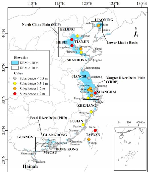 图1 中国36个沿海城市观测到的累计地面沉降(20世纪以来)