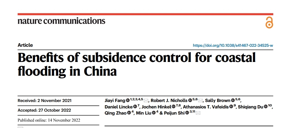 2022年11月14日,《自然-通讯》(Nature Communications)杂志在线发表了北京师范大学地理科学学部史培军教授等合作团队、杭州师范大学方佳毅副教授作为第一作者的最新研究成果,论文题目是“Benefits of subsidence control for coastal flooding in China”,该工作定量评估并揭示了中国沿海地面沉降防控及其降低未来中国海岸洪水风险的成效。