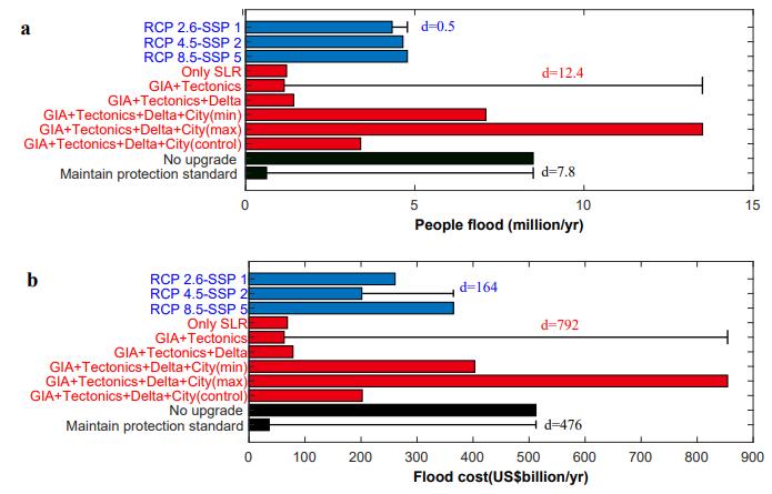 为此,本研究构建了大尺度海岸洪水风险评估模型,定量评估了多种气候变化(RCP)、社会经济情景(SSP)、沿海地区设防情景和地面沉降情景组合下的中国沿海地区海岸洪水的暴露、期望人口和经济损失风险。相对海平面变化包括气候变化因素引起的绝对海平面上升、冰川均衡调整、陆地垂直构造运动、固结造成的自然沉降以及地下流体抽取等原因引起的人为沉降的总和。这些驱动因素是本研究地面沉降情景设置的基础,还重点分析了我国地面沉降控制政策和沿海设防水平不断提高的适应性措施带来的效益。结果表明,考虑到人为因素引起的地面沉降,中国沿海居民面临11 – 20mm/年的相对海平面上升(2015年)影响,这比仅考虑气候因素引起的绝对海平面上升高出3-5倍,反映出沿海人口大量聚集在沉降显著的海岸线。假设未来地面沉降不加以控制,我国相对海平面上升的速率为8.8 毫米/年(2015-2050),这比仅由气候因素引起的高73%。同时,2050年暴露在百年一遇海岸洪水下的土地、人口和资产分别比仅考虑气候因素情景的高出20%-39%、17%-37%和18%-39%。若沿海地面沉降及时得到控制,相对海平面上升速率将减少到4.8毫米/年,对应的暴露土地、人口和资产比仅考虑气候因素情景的分别增加7%、6%和7%。到本世纪中叶,我国仍将面临不断上升的海岸洪水风险。相比而言,地面沉降控制将会有效减少海岸洪水损失,即减少到原有的22-47%,配合设防水平不断提高的适应性措施,中国海岸洪水风险将会进一步降低。