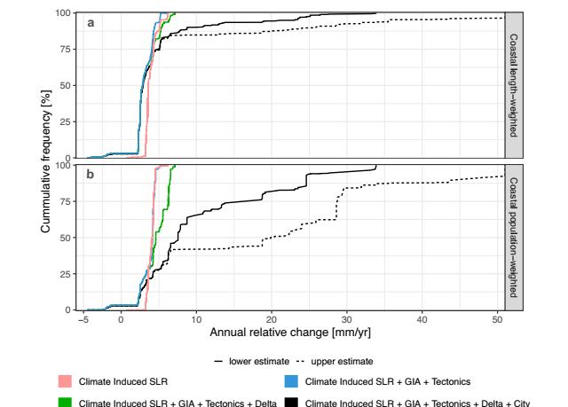 图2 中国沿海相对海平面变化的累计分布。a)长度加权测算方法;b)人口加权测算方法