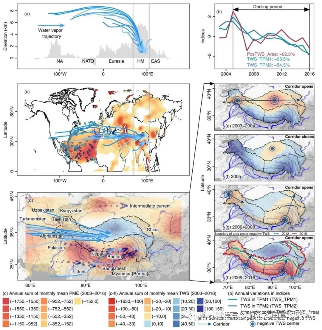 张强教授团队在深入剖析亚洲水塔水汽循环过程的基础上,全面量化了青藏高原的大气环流过程,系统解决了亚洲水塔研究中尚未解决的难点问题。研究团队全面论述并阐明了青藏高原陆地水储量演变的空间异质性及其背后的大气动力学机制(图1)。研究结果表明,青藏高原南部亚洲高山区的陆地水储量下降主要是受西风带传输的源自北大西洋东南部降水-蒸发(PME)亏缺的影响。此外,研究团队还通过动力学模拟证实了亚洲高山区阻止了PME亏缺进一步向青藏高原中部地区的传播,进而引发了青藏高原中部地区陆地水储量的增加。