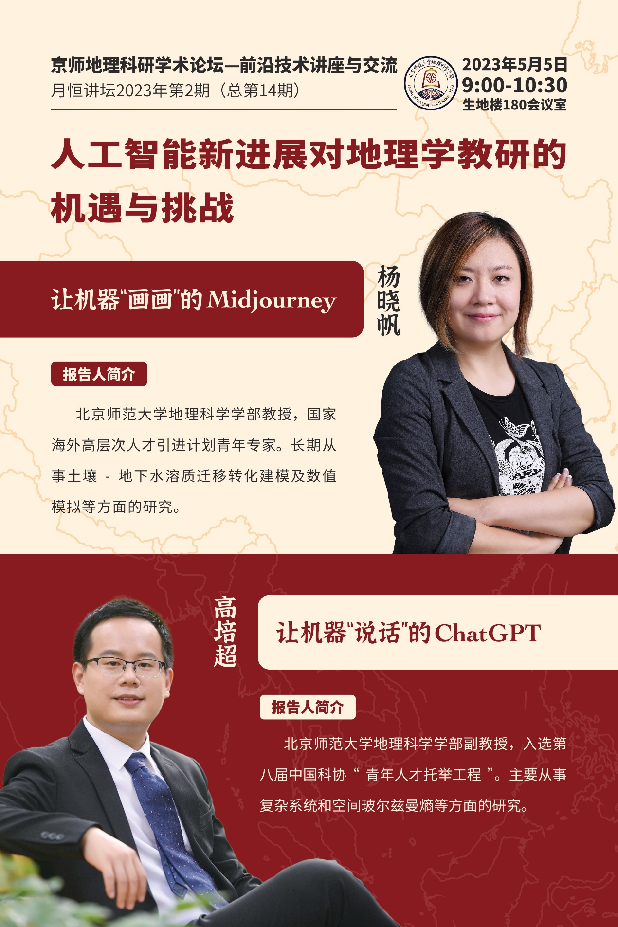 2023年5月5日(周五)上午9:00-10:30,“京师地理科研学术论坛—前沿技术讲座与交流”暨“月恒讲坛”第十四期将在北京师范大学生地楼180会议室举行。本期邀请杨晓帆教授、高培超副教授,以“人工智能新进展对地理学教研的机遇与挑战”为主题进行报告与交流。