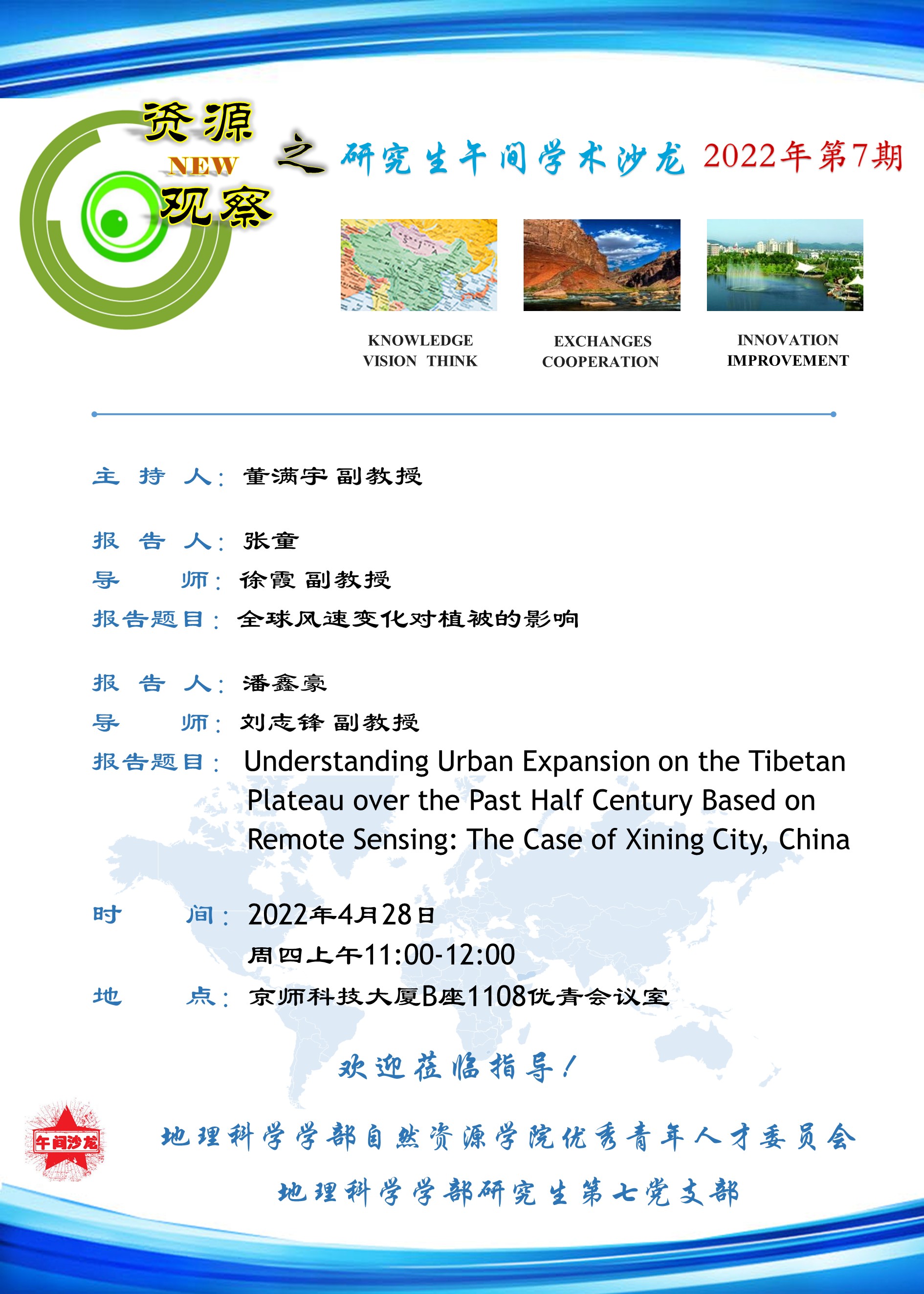 【4月28日研究生学术沙龙】张童:全球风速变化对植被的影响,潘鑫豪:Understanding Urban Expansion on the Tibertan Plateau over the Past Half Century Based on Remote Sensing:The Case of Xining City,China
