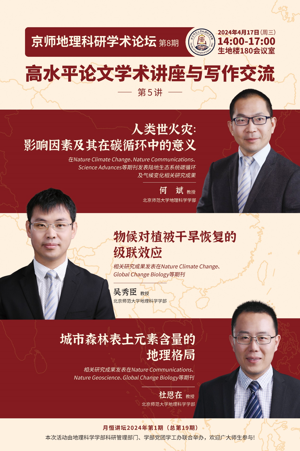 2024年4月17日(周三)下午14:00,京师地理科研学术论坛第8期之“高水平论文学术讲座与写作交流”第五讲将在北京师范大学生地楼180会议室举行。
