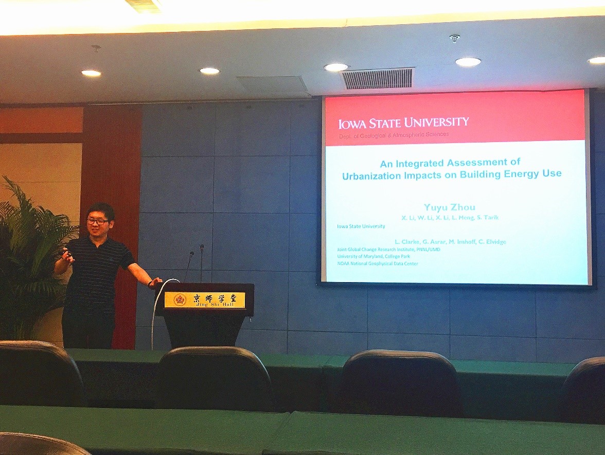 2017年7月19日上午,应何春阳教授邀请,美国爱荷华州立大学地质与大气科学系助理教授周宇宇博士来访,并在京师大厦第一会议室作了题为“An Integrated Assessment of Urbanization Impacts on Building Energy Use”的学术报告。陈云浩教授、陈学泓副教授、黄庆旭副教授、刘志锋博士和朱孝林博士等近40位师生参加了报告会。报告会由何春阳教授主持。
