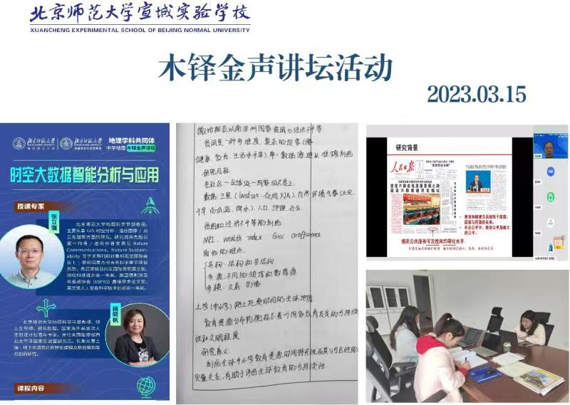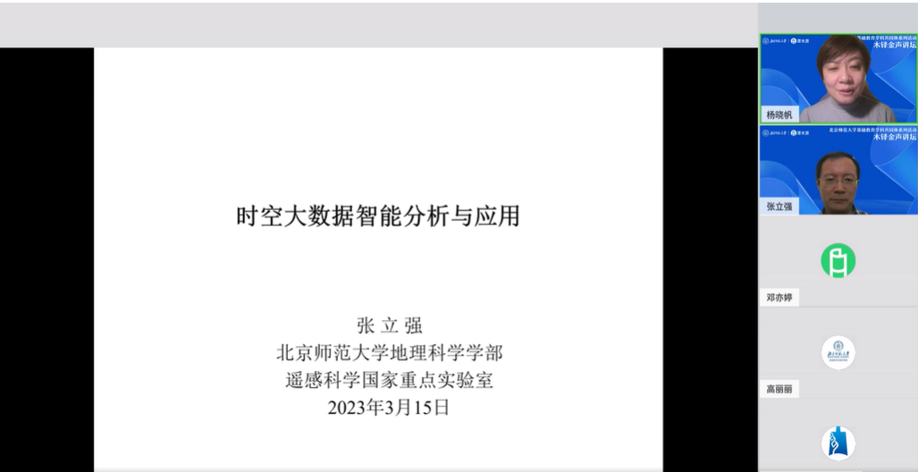2023年3月15日上午,北师大基础教育地理学科共同体中学地理云端“木铎金声讲坛”活动成功举办。活动邀请了国家杰出青年科学基金获得者、北师大地理科学学部张立强教授作题为“时空大数据智能分析与应用”的报告,由北师大地理学科共同体学术委员会、北师大地理科学学部部长助理杨晓帆教授主持。北师大平台学校的教师通过云端相连,共沐了本次时空大数据科学的春风,讲座直播量达650余次。