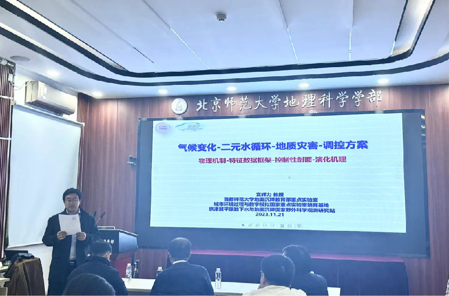 2023年11月21日下午,学术报告——“气候变化-二元水循环-地质灾害-调控方案”成功举办。报告邀请了首都师范大学资源环境学院教授、国家十四五综合防灾减灾规划专家组长、欧亚科学院院士宫辉力教授作为主讲嘉宾,地理科学学部宫阿都副教授担任主持,来自北京师范大学的数十名师生参会,会议以线下的形式进行。