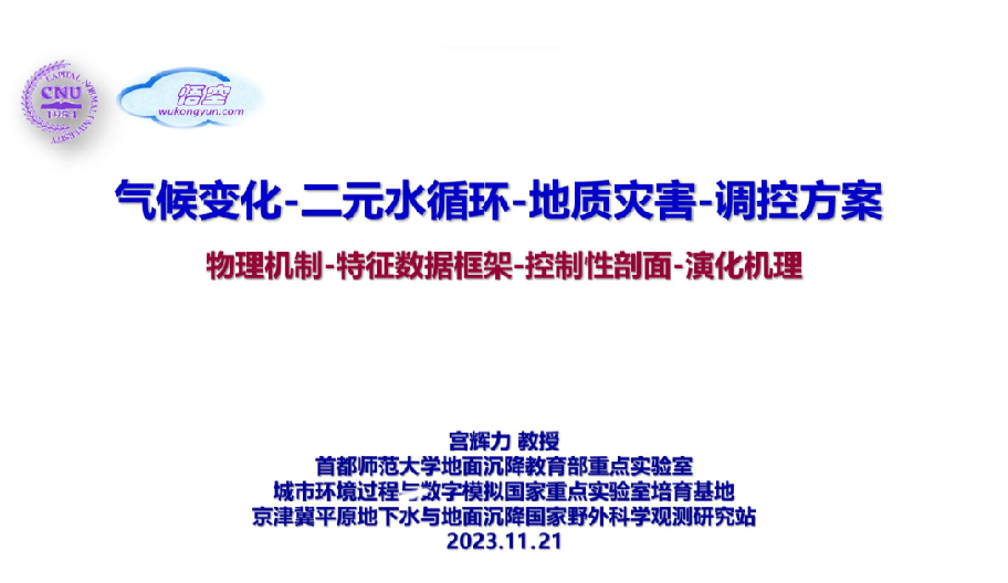 讲座中,宫辉力教授首先介绍了气候变化的背景,气候变化与人类活动强烈影响和改变着区域水循环,控制着地质灾害的复杂演化,这也是气候变化驱动区域水循环和地质灾害关系研究的方法性难题。接下来,他以在气候变化驱动区域二元水循环的新水情、新数据为背景,分别详细介绍了构建二元水循环要素协同分析统一框架,联合遥感大数据数据、分析数据集与气象水文监测台站网和水资源公报等小数据集,耦合具有物理机制的水平衡模型与融入领域知识的机器学习模型,优化不同层次结构的传递函数集与内部变率组合,基于悟空云计算平台开展归因分析等方面的工作内容,从而提供了一套完整且流程化的区域地质灾害调控方案。