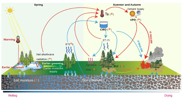 进一步的机制分析表明,积雪提前消融导致春季植被提前返青和水分过早消耗,从而加剧了植物水分亏缺。水分亏缺的加剧限制了蒸发冷却作用,增加了感热通量,进一步抬升了局地气温,从而增加了VPD。为应对大气干燥度的增加和水分亏缺的加剧,植被通过调整生长策略,将更多营养物质分配给年轻的组织和器官,同时限制年老叶片的资源消耗并诱导其衰老和脱落,最终以凋落物的形式增加了可燃物累积,从而显著提升了融雪后的火灾风险(图4)。