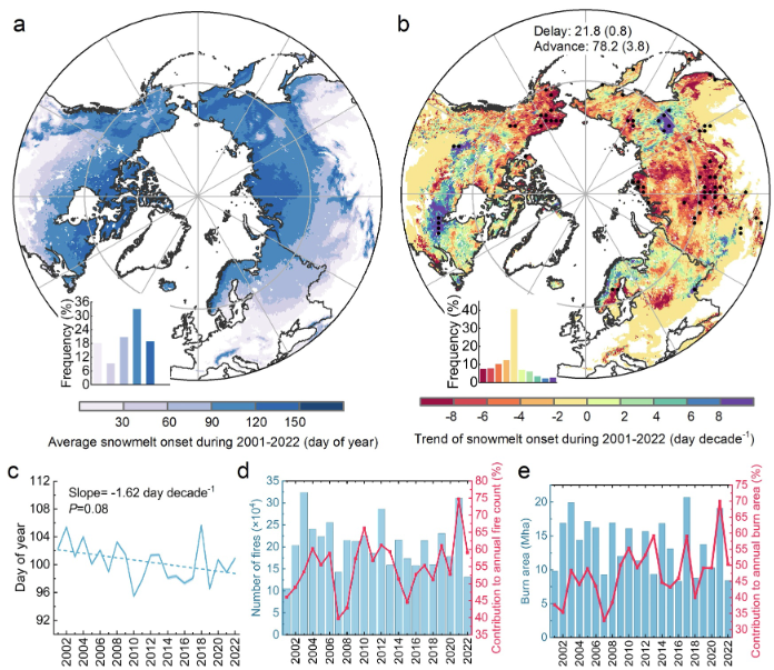 图1 基于ERA5 Land SWE提取的融雪开始时间时空变化格局,以及融雪后火灾次数和燃烧面积的变化。