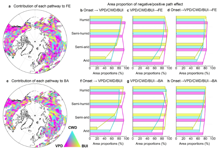通过融合相关分析与结构方程模型等多元统计方法,研究表明融雪开始时间提前通过增加融雪后的VPD、CWD和BUI,为火灾发生创造了有利条件,促进了融雪后的火灾次数增加和燃烧面积增大。路径分析结果进表明,在这一过程中,VPD是融雪开始时间提前对融雪后燃烧面积和火灾次数促进作用的关键因素。VPD在约51%的区域发挥了主导作用,贡献了促进作用的57%左右。相比之下,CWD和BUI对融雪开始时间提前促进融雪后燃烧面积和火灾次数的主导作用次之,且两者的影响强度相近,其贡献度约为VPD的一半(图2-3)。