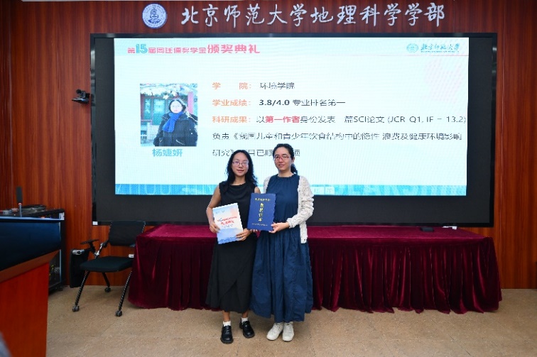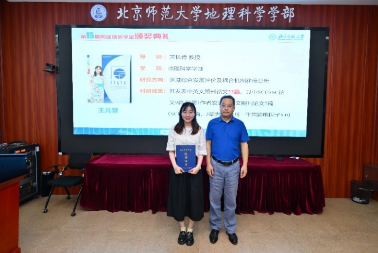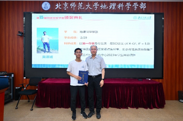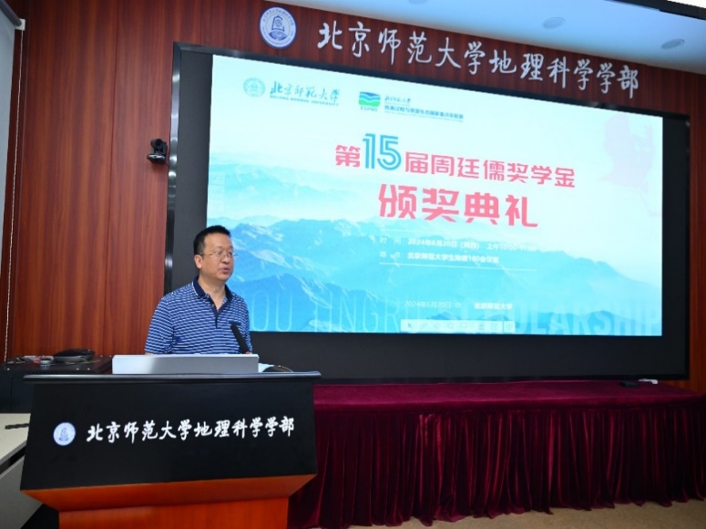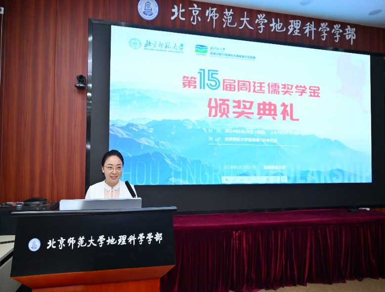 颁奖典礼由奖学金评审委员会秘书长何春阳教授主持。北京师范大学教育基金会杨艺副秘书长在致辞中表示,周先生从事地理科学研究与教育工作50余年,为北京师范大学乃至中国地理学和地理教育的发展做出了卓越贡献,希望同学们秉持周先生的学术精神和治学风范,日益进取、兢兢业业,投身地理学、生态环境科学事业当中,贡献自己的力量。她代表北师大教育基金会感谢各位师长友人长期以来对周廷儒奖学金、对北师大地理学科建设和人才培养的关心,并表示基金会将一如既往的支持此活动。