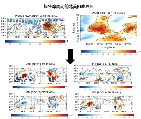 图2.在东太平洋型厄尔尼诺 (EP El Niño) 和太平洋年代际涛动负相位 (PDO-) 的背景下,北美阻塞事件合成的500hpa位势高度(Geopotential height, Z500) 、 2米地表气温(2m temperature, SAT) 、饱和水汽压差(Vapor Pressure Deficit, VPD)、降水(Precipitation, P)、土壤湿度(Soil Moisture, SM)和火灾天气指数(Fire weather index, FWI)异常在lag-10 to 10天平均的空间分布。