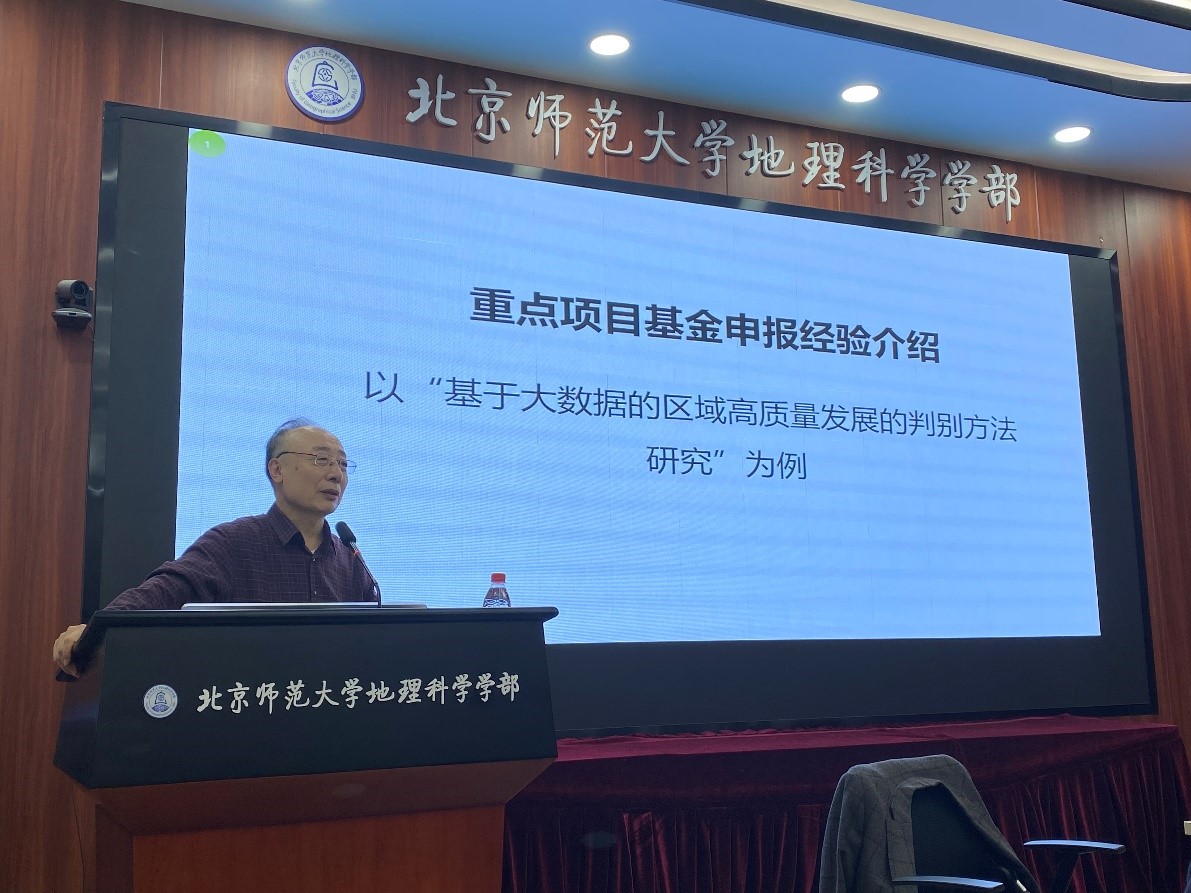 2022年10月14日下午,“京师地理讲坛”第十三讲在北京师范大学生地楼180会议室成功举办。此次讲坛邀请地理科学学部部长宋长青教授,以新获批国家自然科学基金重点项目“基于大数据的区域高质量发展的判别方法研究”为案例,对地理学的国家战略需求、前沿科学问题进行了精彩纷呈的讲解,并详细分享了国家自然科学基金重点项目的学术思想与申报经验。会议由学部副部长蒋卫国教授主持,学部近百名教师、博士后、研究生参加。