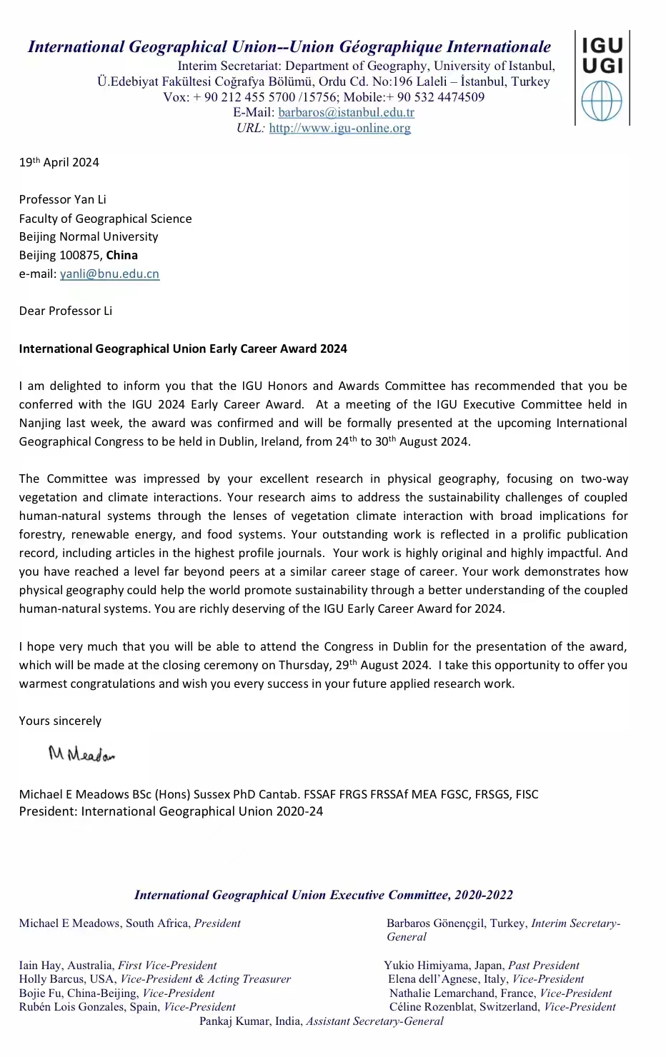国际地理联合会(IGU)在近日公布,学部李琰研究员荣获2024年国际地理联合会青年奖(IGU Early Career Award in Geography),并将于8月24-30日在爱尔兰都柏林举办的国际地理联合会上正式领奖。