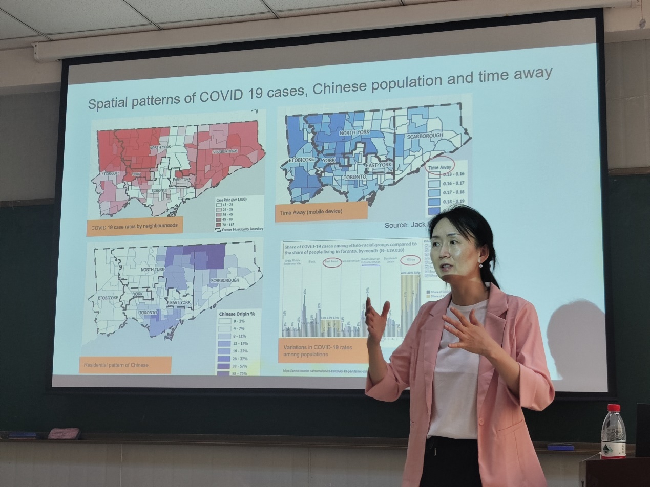 本次讲座,Lu Wang教授重点分享了她所主持的由CIHR(Canadian Institutes of Health Research)和加拿大SSHRC(Social Sciences and Humanities Research Council)资助的两项科研项目的相关研究成果。第一个项目以加拿大多伦多地区的华人社区为例,探讨了新冠大流行对人口空间移动模式变化的影响,分析了预防措施随时间变化的模式及其与新冠肺炎认知风险和个体特征的动态关系,为及时地制定公共卫生政策以改善不同背景的个体预防实践提供了重要的见解。第二个项目使用定量与定性相结合的混合方法研究多伦多地区老年人口对家庭医生的可达性,揭示了老年移民群体在新冠疫情之前和期间使用初级卫生保健服务的关键模式变化,对新冠大流行期间弱势群体的就医行为、可达性和医疗服务质量之间的关系进行了深入分析。最后,Lu Wang教授和与会师生就新冠大流行背景下时空数据的获取、分析模型中细节的处理、多伦多地区医疗资源供给的空间异质性、现阶段新冠疫情影响、社会经济发展水平与流行病感染率的关系等议题进行了热烈的讨论,现场科研氛围浓厚,与会师生均表示在此次讲座中受益匪浅。