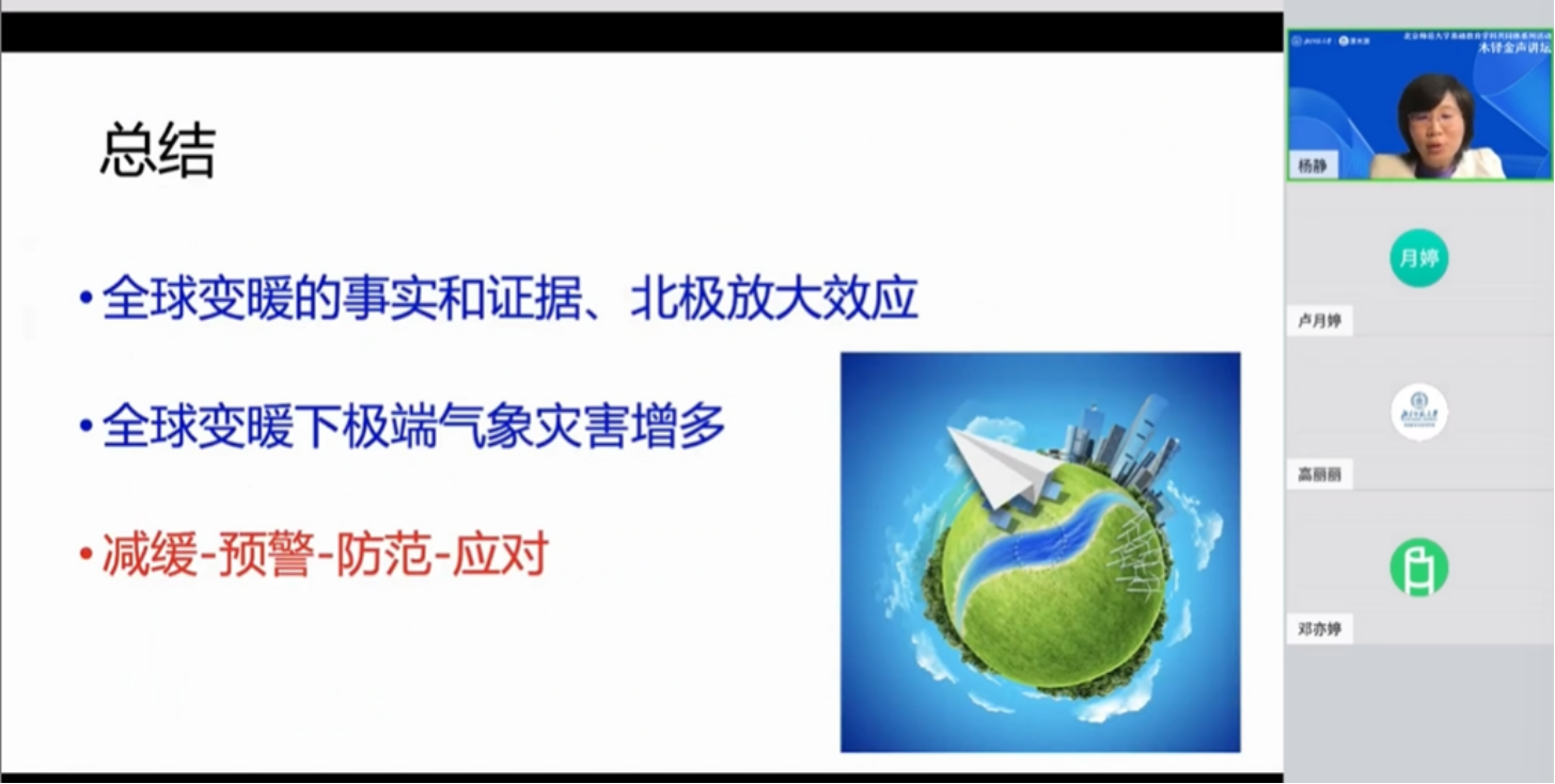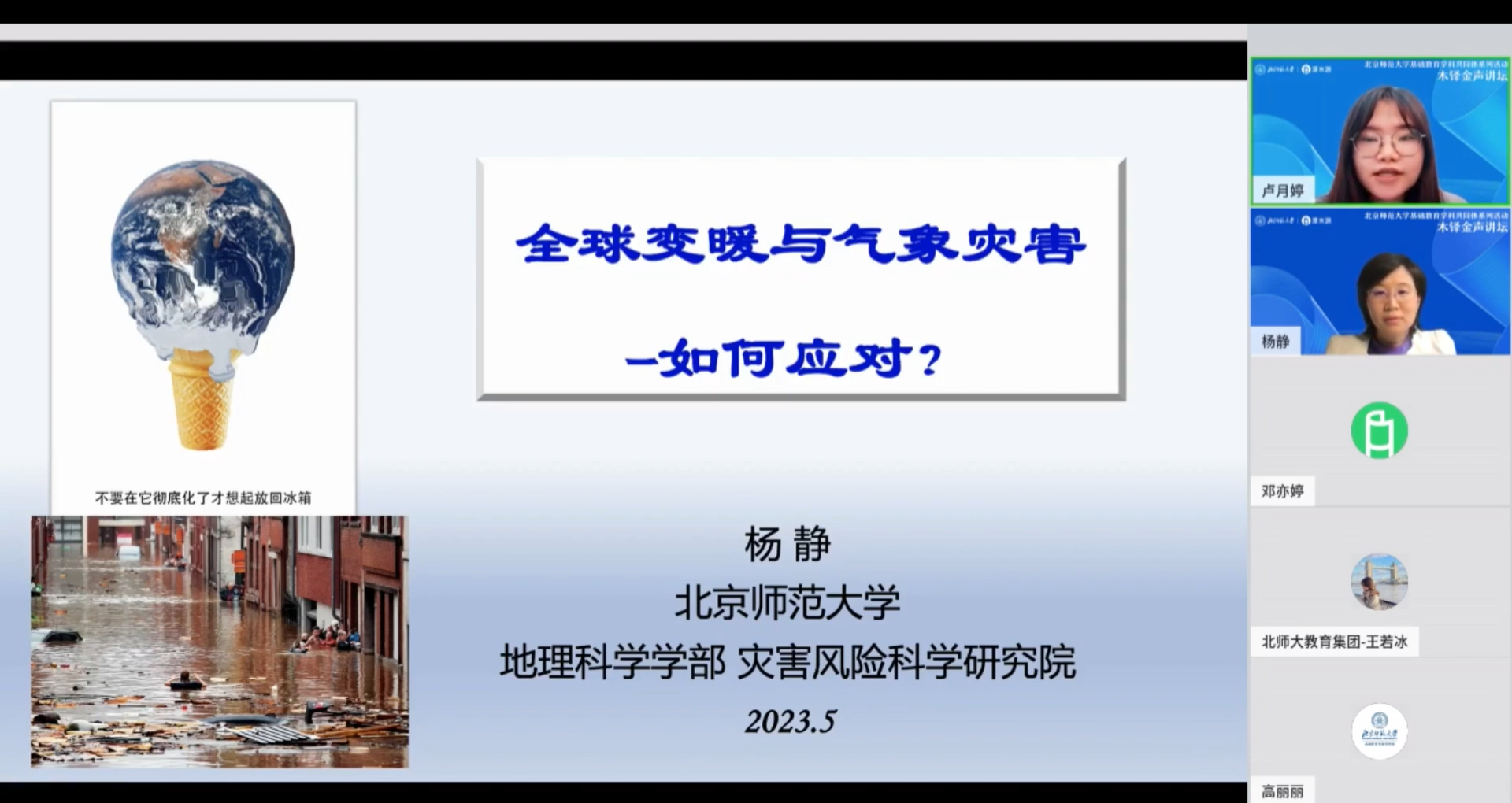 2023年5月11日下午,北师大基础教育地理学科共同体中学地理云端“木铎金声讲坛”讲座成功举办。活动邀请了国家基金委优青获得者、北京市高等学校青年英才、北京师范大学地理科学学部杨静教授作题为“全球变暖与气象灾害:人类如何应对?” 的主题报告,由北师大地理学科共同体学术委员会、北师大地理科学学部部长助理杨晓帆教授主持,约450名北师大附校的师生通过云端相连,共同学习全球变暖与气象灾害相关知识。