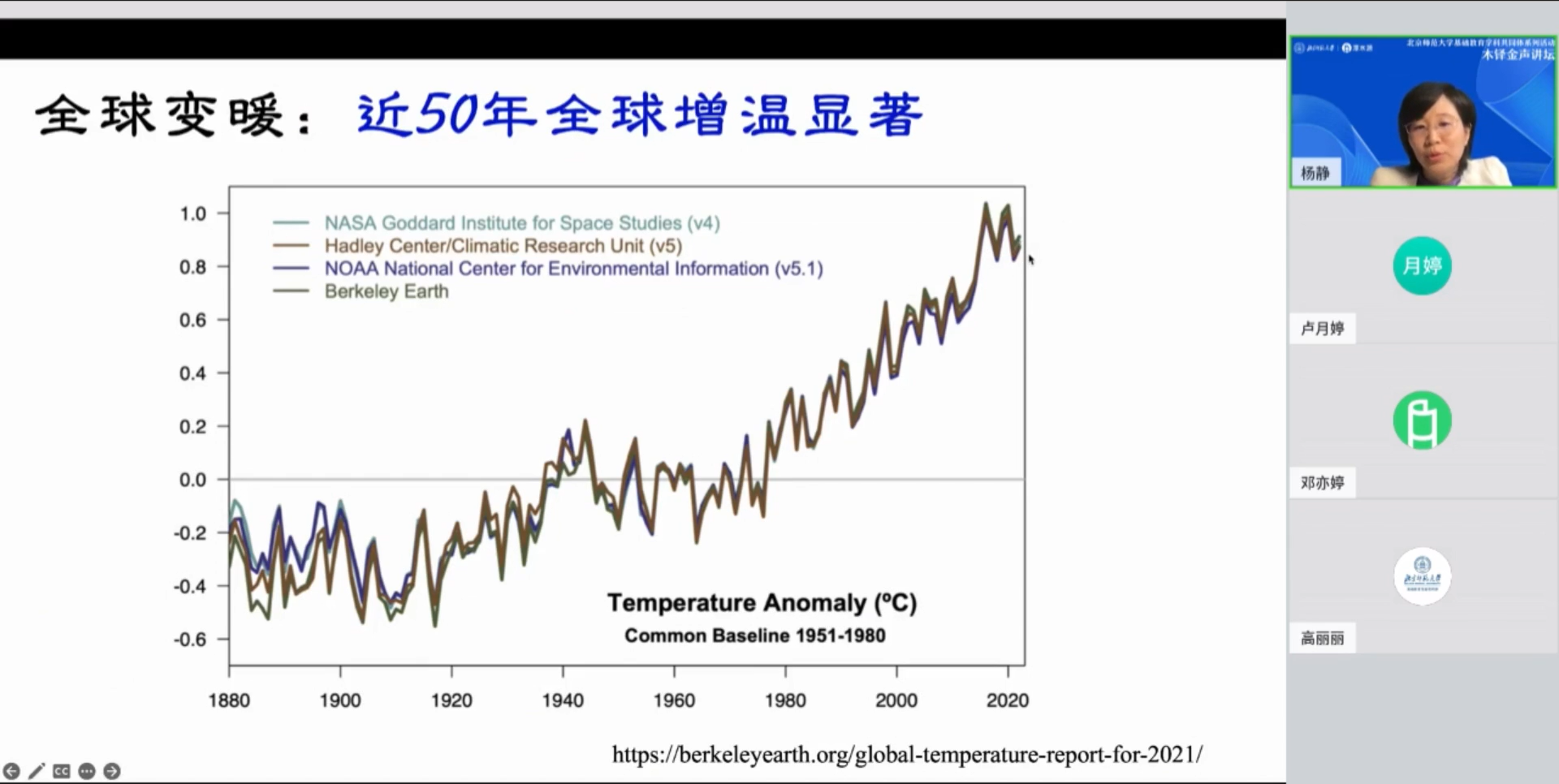 杨静教授首先以可以反映全球二氧化碳含量状态的夏威夷全球二氧化碳观测站数据作为切入点,讲解与全球变暖密切相关的温室气体。她表示,大气适量的温室气体让地球宜居,然而观测到的逐年增加的二氧化碳等温室气体将促使全球变暖。通过梳理近50年全球增温和变暖的变化,尤其是中高纬地区和极地地区的增暖变化,她表示,近半个世纪的增暖速率是前所未有的,未来增温很大可能加剧。