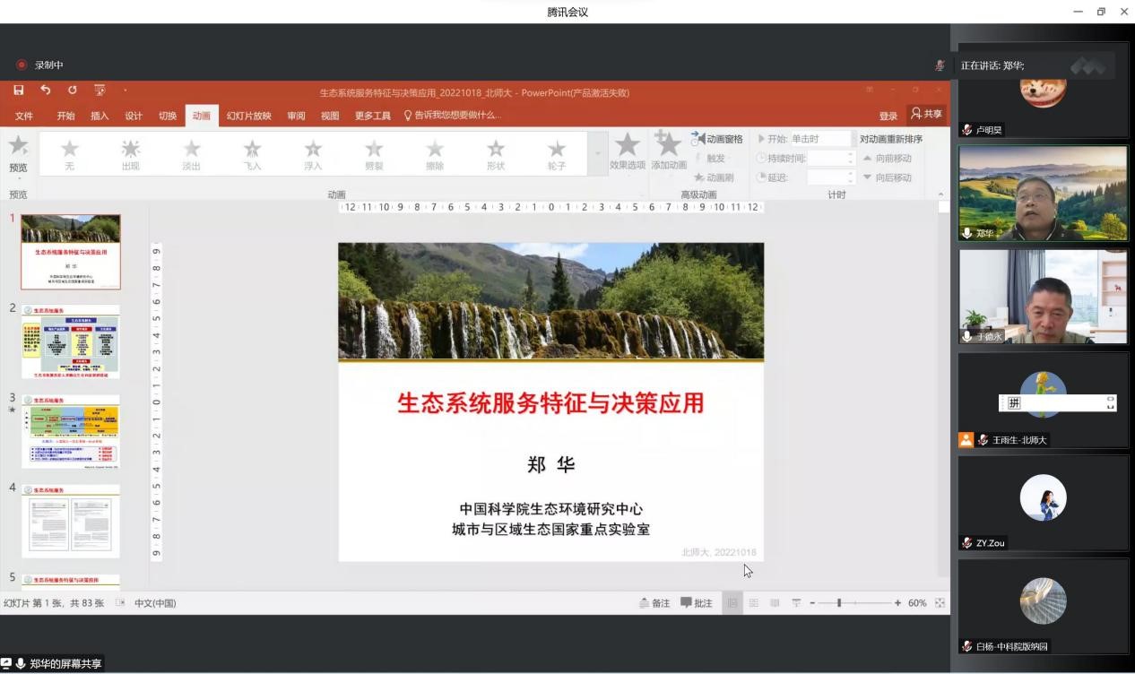 2022年10月18日上午,地理科学学部自然资源学院资源科学前沿系列讲座第八期——“生态系统服务特征与决策应用”成功举办。本次讲座由于德永教授主持,邀请了中国科学院生态环境研究中心城市与区域生态国家重点实验室副主任、国家杰出青年科学基金项目获得者郑华研究员为主讲嘉宾,讲座以线上会议的形式进行,吸引了校内外三百余名业内专家及学生参加。