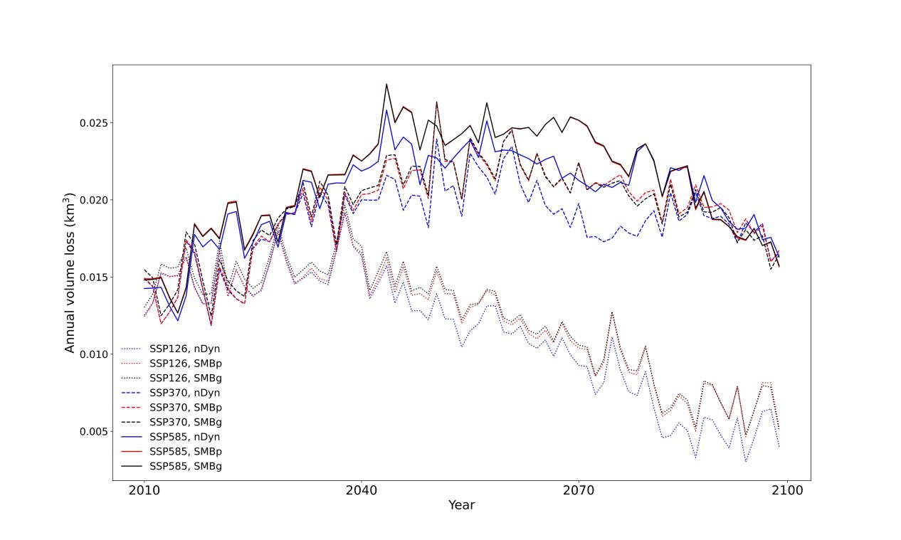 图1:在SSP-126、SSP-370和SSP585三种气候情景下的东绒布冰川体积变化情况
