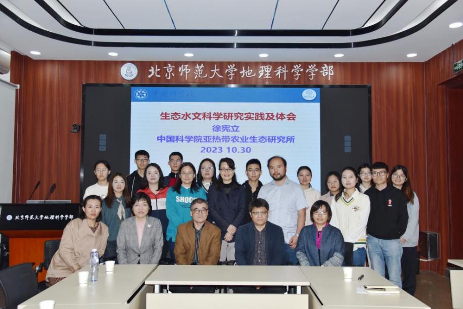 2023年10月30日上午10点,地理科学学部地理学院地理学前沿系列讲座2023年度第13期在生地楼180会议室顺利举办。本次讲座由张卓栋副教授主持,邀请中国科学院亚热带农业生态研究所徐宪立研究员作了题为“生态水文科学研究实践及体会”的报告。地理学院院长张科利教授、符素华教授、殷水清教授、杨扬副教授等教师及20多名学生参与了本次讲座。