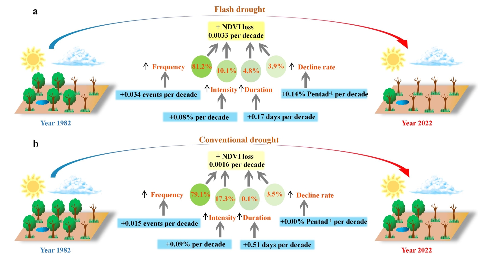 全球变暖加剧大气干旱,同时降水格局变化导致小雨事件减少,干旱间隔延长。这些因素共同促使全球土壤湿度下降,尤其是“骤旱”事件频发。这类干旱发展迅速,通常在数周内导致严重土壤水分亏缺。与缓慢发展的传统干旱不同,骤旱因其突发性强、强度大,可能对植被造成更严重的冲击。然而,全球范围内关于骤旱对植被影响的系统性研究仍较为缺乏。