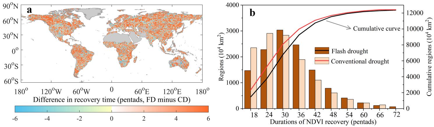 研究指出,骤旱因其突发性和高强度,对植被造成的冲击更大、恢复更慢,可能威胁生态系统生产力、碳汇功能及粮食安全。与传统干旱相比,骤旱留给植被的适应窗口更短,通常需要更快速的应急响应,如紧急灌溉和水资源调配。该研究强调应将骤旱特性纳入气候变化适应策略、生态系统管理与干旱监测体系中,以应对其日益加剧的生态影响。