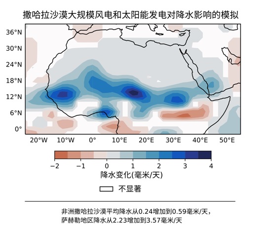 为实现全球升温限制在2度以内的目标,需要大幅度减少人为温室气体排放。撒哈拉沙漠具有丰富的风力和太阳能资源,大规模开发利用不仅可为人类提供清洁的再生能源,减少对化石燃料的依赖,也可成为应对气候变化的有效手段。然而,风电和太阳能发电设施会改变地表特性,当规模足够大时,可能会对区域气候产生显著影响。