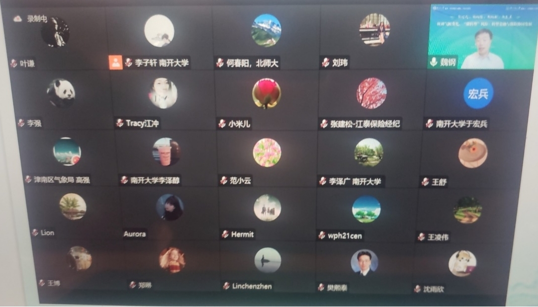 联会开幕式由南开大学金融学院副院长刘玮教授主持,南开大学金融学院常务副院长范小云教授和地理科学学部灾害风险研究院院长何春阳教授致辞,共同表达了对跨学科、跨领域、跨部门的合作对应对气候变化风险的积极促进作用,期望以此次活动为起点,将双方的合作进一步深化和持续发展下去。灾研院叶谦教授以“应对气候变化的三个“永恒”风险”为题,在开幕式上与参会嘉宾分享了组织此次联会的目的和意义,南开大学灾害风险管理巨灾保险研究中心执行主任魏钢教授从金融保险角度,深入浅出的解读了在应对灾害风险重构金融机制产品的紧迫性、问题与挑战。