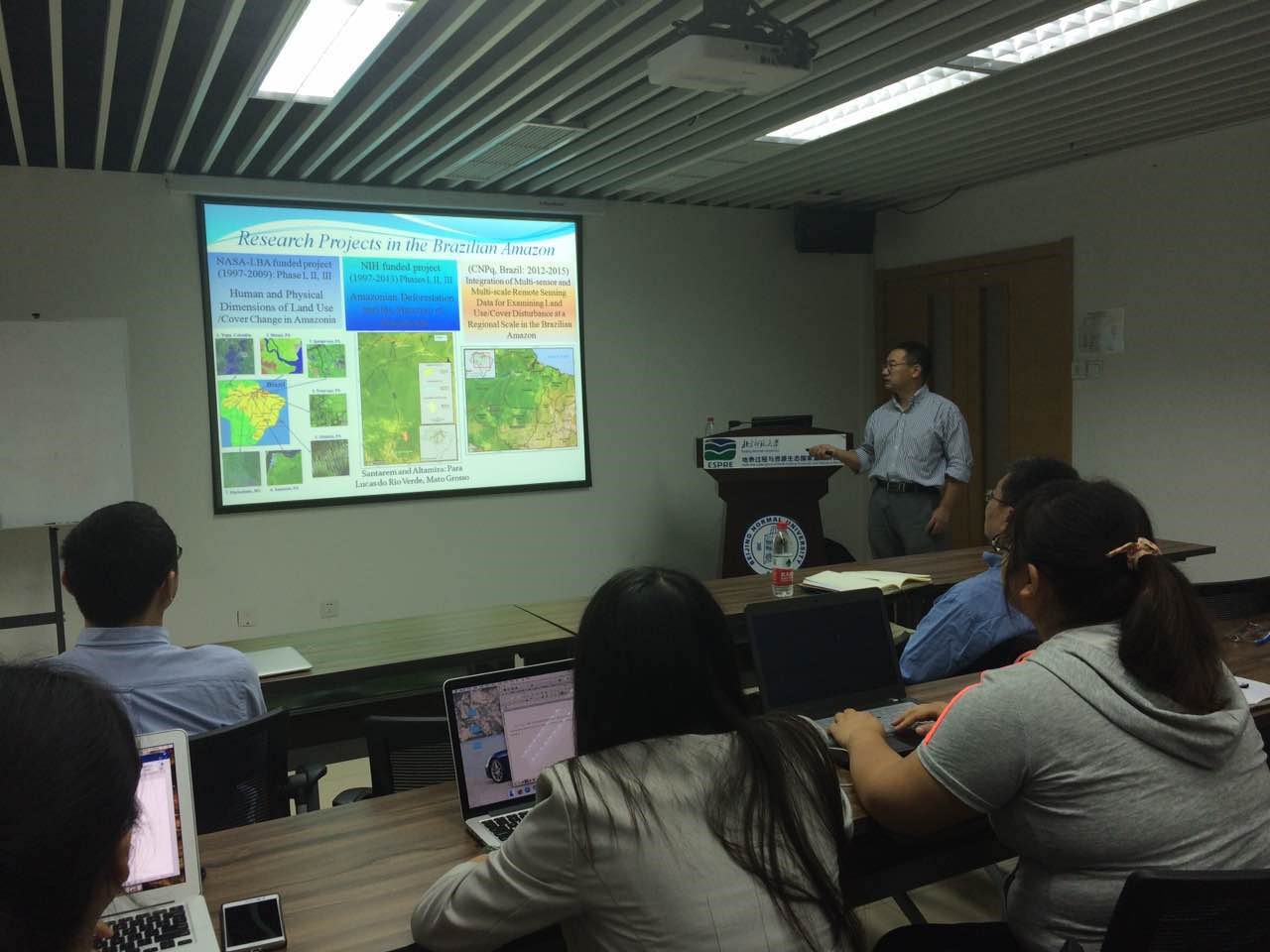 2016年9月22日下午,应实验室景观团队何春阳教授邀请,美国密歇根州立大学全球变化与对地观测研究中心陆灯盛教授来访并在京师科技大厦933会议室作了题为“基于遥感的不透水地表提取方法——现状与展望”的学术报告。报告会由何春阳教授主持。陈晋教授、陈学泓副教授和黄庆旭副教授等60多位师生参加了会议。