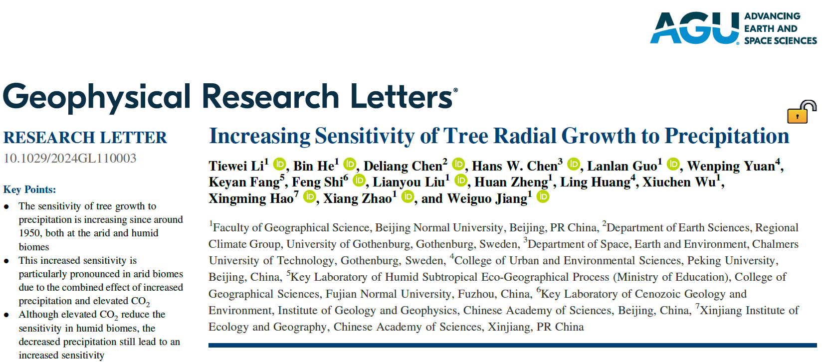 2024年8月27日,北京师范大学地表过程与资源生态国家重点实验室何斌教授研究小组与合作者在Geophysical Research Letters杂志发文“Increasing Sensitivity of Tree Radial Growth to Precipitation”,揭示了树木径向生长对降水敏感性的时空变化格局及其驱动因素。