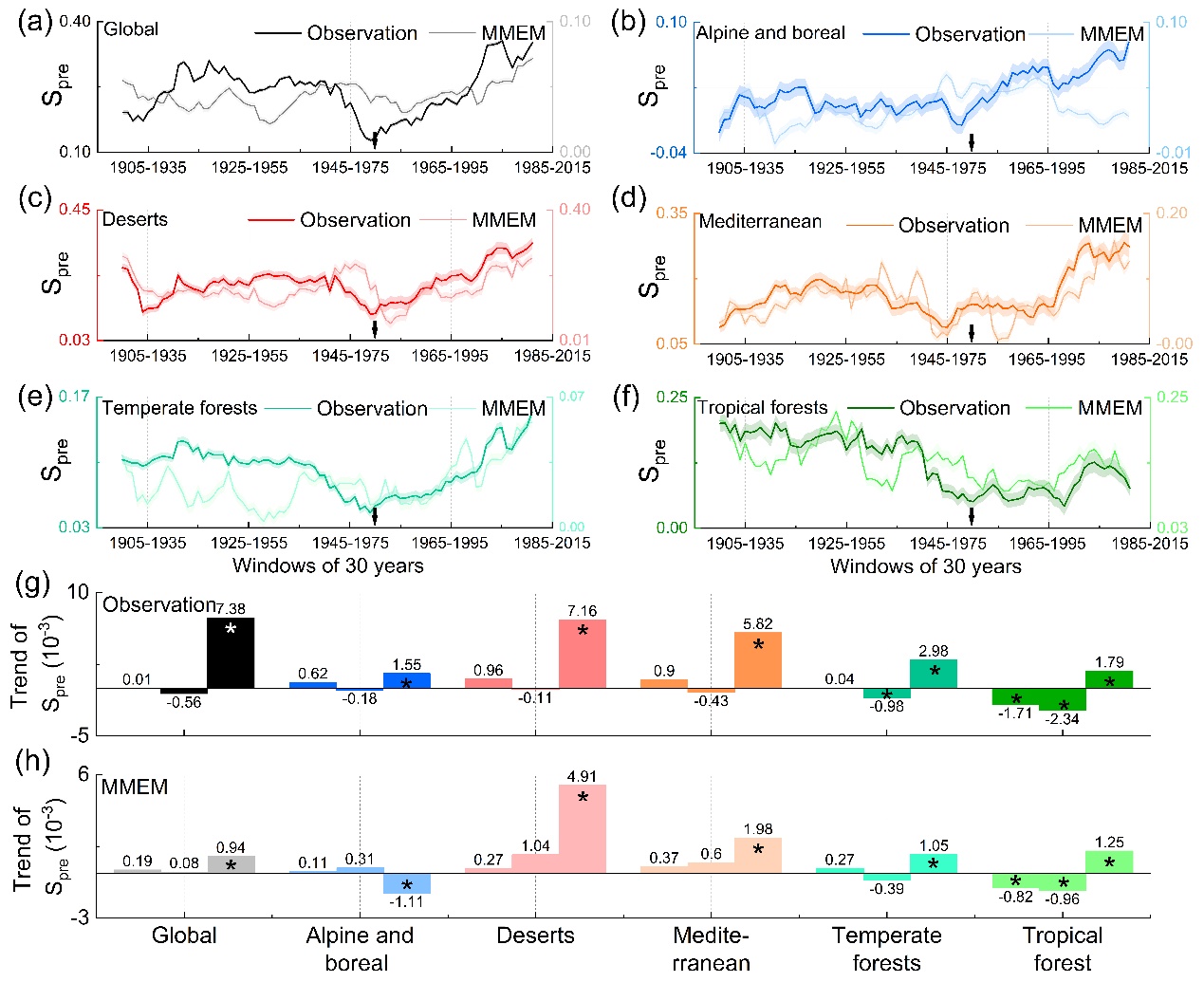 图2:(a-f) 不同生态群落中降水敏感性的长期变化;(g-h) 1950年前后两个时期内降水敏感性的平均变化趋势。