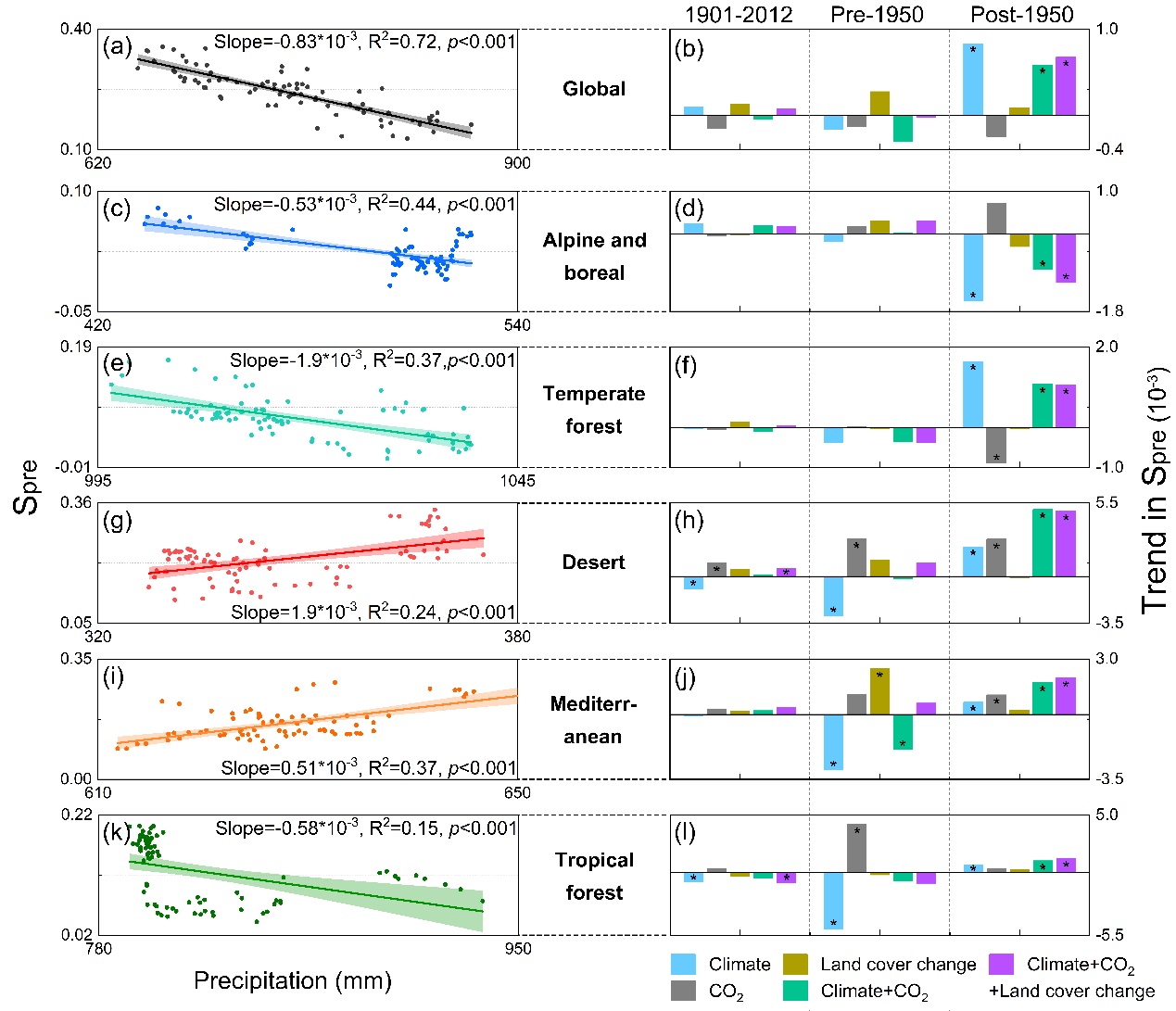 图3:左侧散点图表示不同生态群落降水敏感性与平均降水之间的关系;右侧柱状图表示基于全球动态植被模型量化的不同驱动因素对降水敏感性变化的贡献。