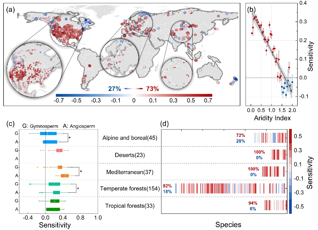 图1:(a) 树木生长对降水敏感性的空间分布格局; (b) 降水敏感性沿干燥梯度的变化; (c) 不同生态群落中裸子植物和被子植物的降水敏感性差异;(d) 不同生态群落中主要树种的降水敏感性。