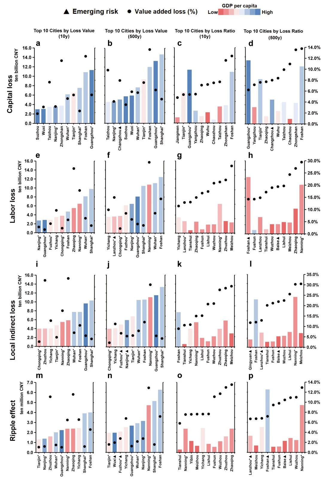 研究主要发现,洪水损失随灾害强度呈非线性增长:高频低强度洪水中,直接资本损失占主导;而低频高强度洪水中,本地间接损失成为主要损失构成。空间上存在显著差异:富裕城市尽管绝对损失值更大,但其损失占GDP的比重较低;经济基础较弱的城市则承受着更高比例的经济冲击,尤其是通过劳动力渠道的影响更为显著。同时,经济溢出效应高度集中于主要枢纽城市,这显著放大了整个经济网络的系统性风险。研究进一步指出,简单加总各城市的独立压力测试结果只能得到保守的风险下限;而以长三角地区为例的联合冲击模拟则显示出强烈的风险放大效应。该研究为实施针对各个区域与各类行业的差异化适应与恢复策略提供了科学依据。