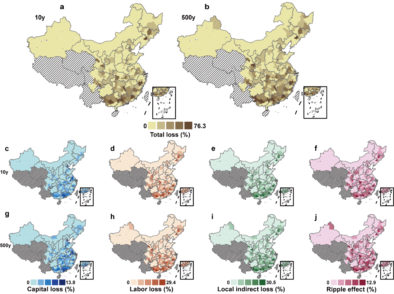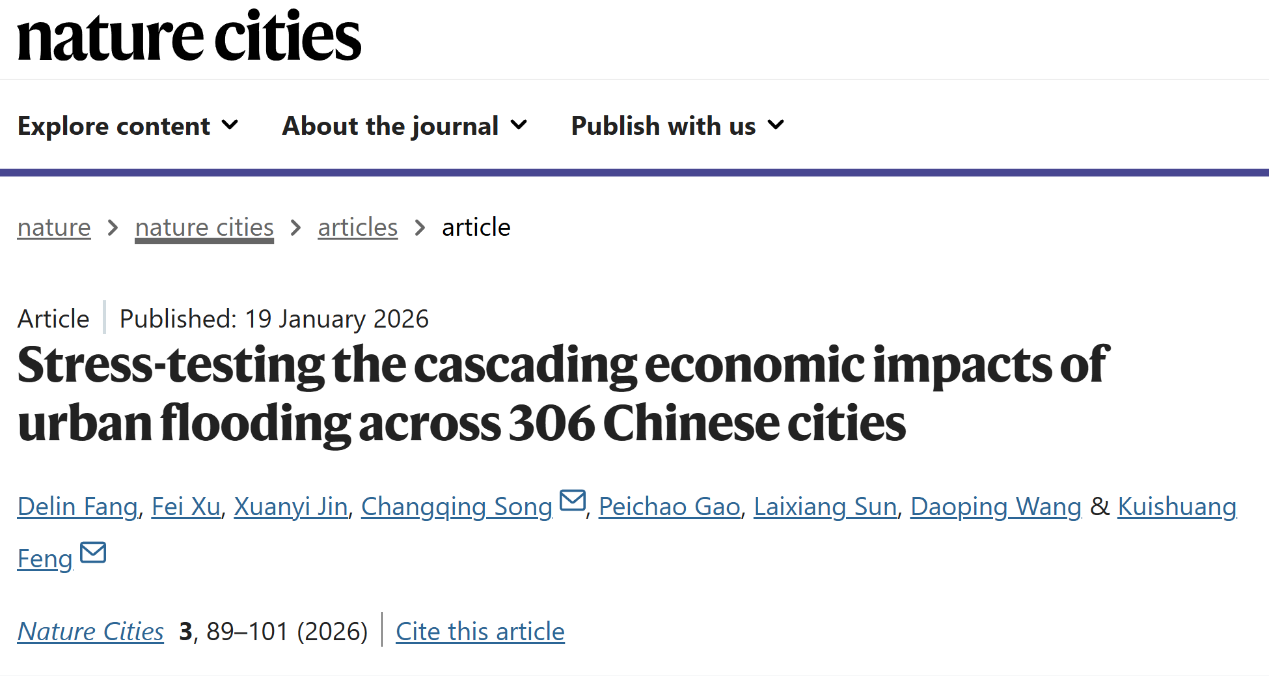 近日,北京师范大学地理科学学部地理数据与应用分析中心房德琳副教授作为第一作者,宋长青教授与香港大学冯奎双教授作为共同通讯作者,在《自然-城市》(Nature Cities)期刊发表题为“中国306城市洪水级联经济影响的压力测试”(Stress-testing the cascading economic impacts of urban flooding across 306 Chinese cities)的研究论文。该论文以地表过程与水土风沙灾害风险防控全国重点实验室为第一单位,研究构建了耦合洪水淹没灾损评估与风险拓展多区域投入产出的综合模型,揭示我国306座城市面临洪水灾害导致的直接损失及其沿供应链跨域传导的级联损失演化机制。