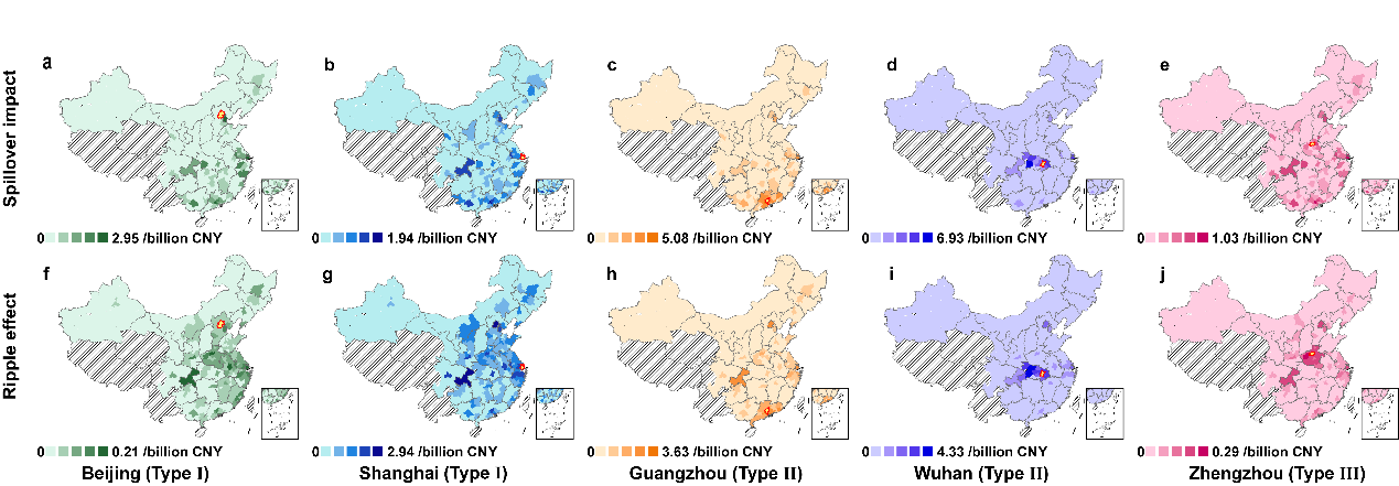 图3 北京(a, f)、上海(b, g)、广州(c, h)、武汉(d, i)、郑州(e, j)的溢出损失和波及效应的空间分布